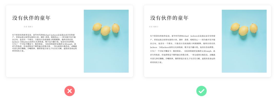 新手排版時,有時候會因?yàn)槲谋緝?nèi)容過長,而版式又受限,會選擇去壓縮字符間距的方式來達(dá)到控制文本長度的目的。其實(shí)這是一個容易被忽略的錯誤,因?yàn)樽珠g距過于擁擠會降低文字的可讀性。