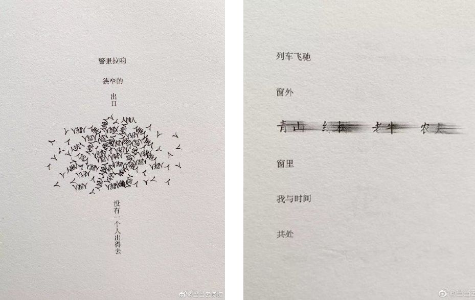 關(guān)于文字的表現(xiàn)形式,有本書叫做《設(shè)計詩》,它里面的內(nèi)容基本上都是用不同樣式的文字,表達出整首詩的意境,比如:
