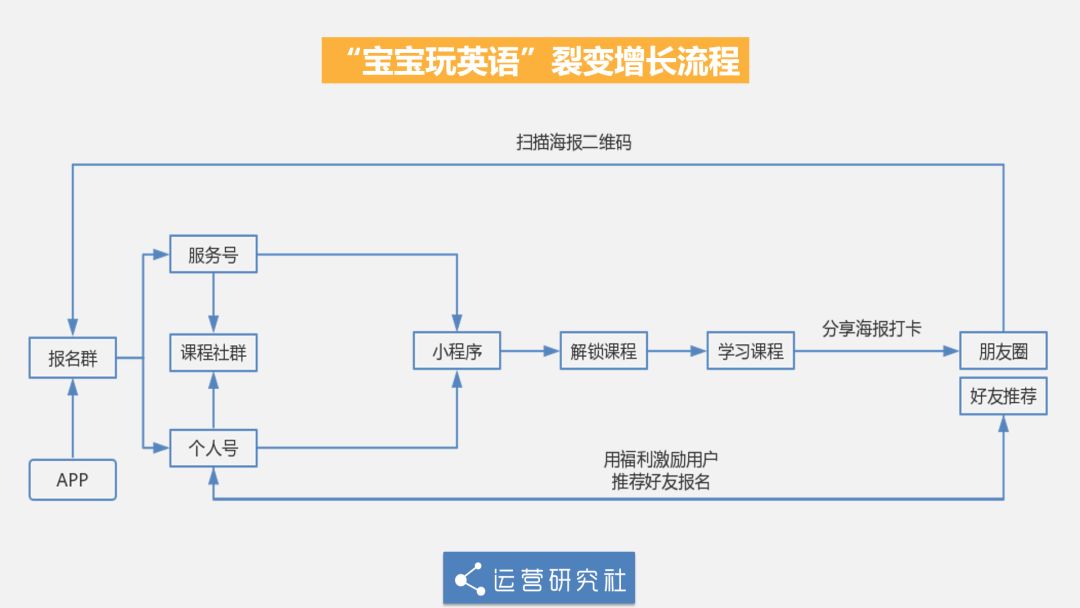 App:① 在 App 中報(bào)名免費(fèi)課,會(huì)進(jìn)入報(bào)名群,報(bào)名群引導(dǎo)用戶關(guān)注服務(wù)號(hào)和添加個(gè)人號(hào);② 個(gè)人號(hào)會(huì)拉用戶進(jìn)入正式課程社群,也會(huì)根據(jù)寶寶年齡和家長(zhǎng)時(shí)間提供對(duì)應(yīng)的課程小程序;③ 用戶可以在小程序解鎖課程和學(xué)習(xí)打卡,打卡海報(bào)分享到朋友圈后,吸引潛在用戶掃描二維碼添加個(gè)人號(hào)