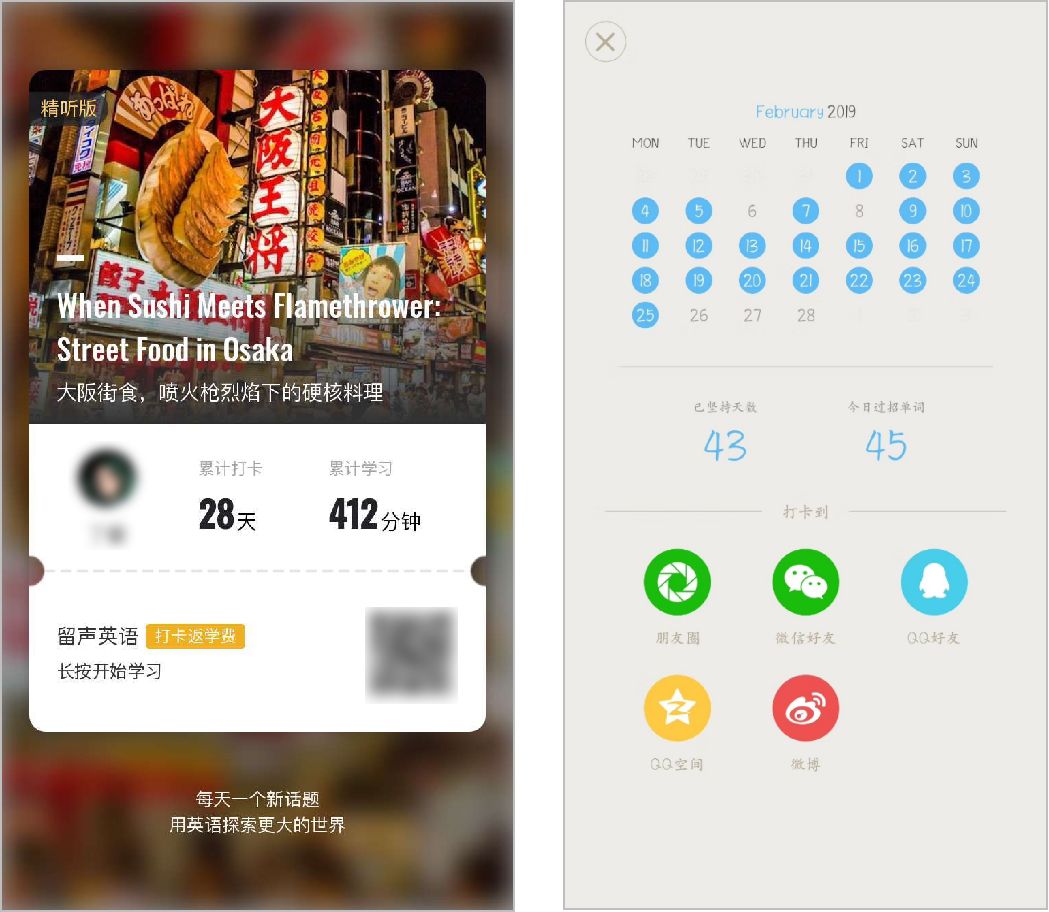 可以在分享海報(bào)的設(shè)計(jì)上,可以加入幫助用戶「裝逼」的內(nèi)容,例如很多產(chǎn)品的打卡海報(bào)都會(huì)強(qiáng)調(diào)用戶的「打卡天數(shù)」和「學(xué)習(xí)效果」。