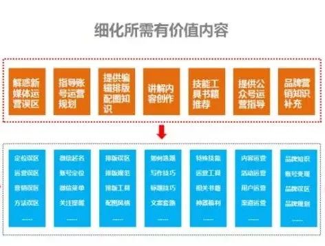 比如一個面向新媒體運營的公眾號,它的“用戶成長所需知識”以及對應(yīng)進(jìn)一步細(xì)化的內(nèi)容就是這樣的: