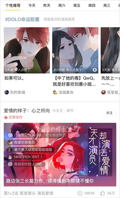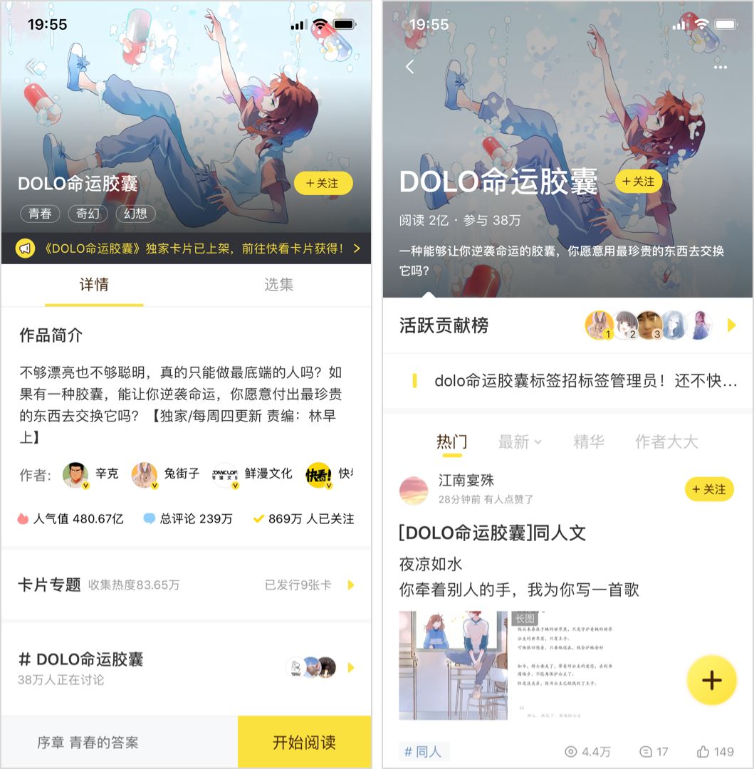 比如,以平臺流行元素“丑小鴨變天鵝”、“校園戀情”、“三角關系”等作為命題構思創(chuàng)作出來的《DOLO 命運膠囊》(作者 @兔街子+快看漫畫團隊),人氣值高達 480.59 億,評論數量高達 239 萬,關注人數 869 萬,同名話題閱讀量高達 2 億,成績非常突出。