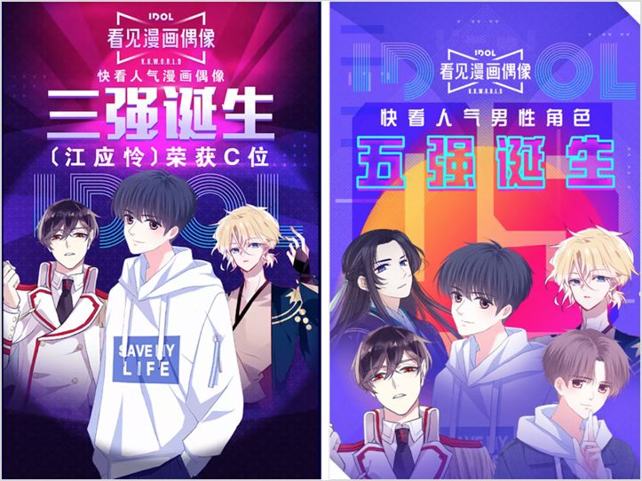 比如,快看漫畫曾舉辦了一個“看見漫畫偶像”的活動,是國內首個針對漫畫角色的打榜活動(恰逢《偶像練習生》和《創(chuàng)造 101 》先后火爆),讓用戶投票選出人氣男性角色。