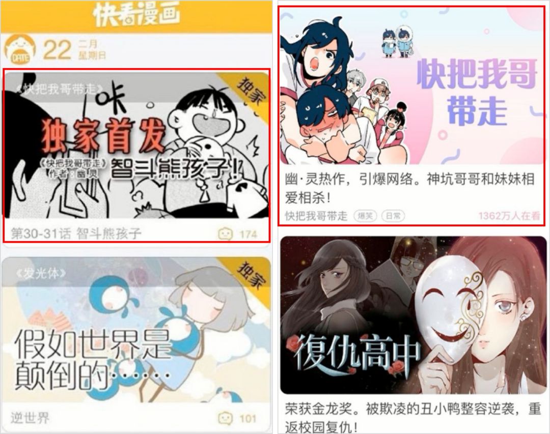 快看漫畫從一開始就推出了“條漫式”的漫畫形式,更適合手機閱讀。當時其他漫畫平臺都在用頁漫形式,單頁信息量大,雖然適合實體書和電腦端,但從手機上看閱讀體驗較差。
